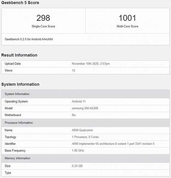 Конечно, точного названия процессора в бечмарке нет, но, если судить по его характеристикам и кодовому имени lito, это Snapdragon 750G. Данная аппаратная платформа также использовалась в модели Samsung Galaxy A42. Мобильник имеет 6 ГБ оперативной памяти, а управляет его работой операционная система Андроид 11.