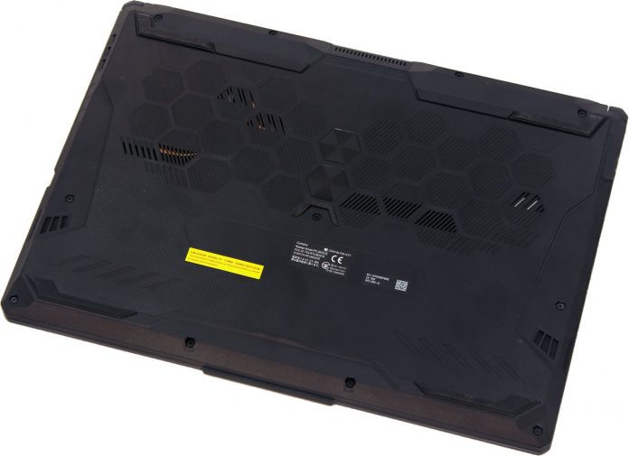Нижняя часть корпуса целиком закрыта крышкой. Вентиляционные отверстия выполнены в форме сот и украшены двумя значками радиационной активности в центре. Поверхность очень жесткая и хорошо сопротивляется механическим нагрузкам. В качестве опор выступают крупные резиновые ножки, способные надежно зафиксировать ноутбук.