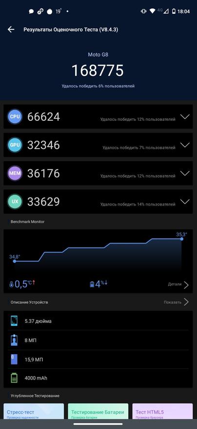 Рассмотрим технические характеристики Motorola G8. Смартфон построен на базе процессора Snapdragon 665. Это не самый свежий, но проверенный чипсет среднего уровня. Вдобавок, у многих смартфонов по аналогичной цене установлены камни от MediaTek.