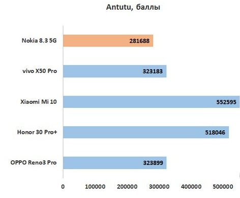 В тесте производительности AnTuTu герой обзора набирает 280 тысяч баллов. Это явно не уровень устройства ценой 49 990 рублей. В таком гаджете должен быть Snapdragon 865, но в Nokia посчитали иначе.