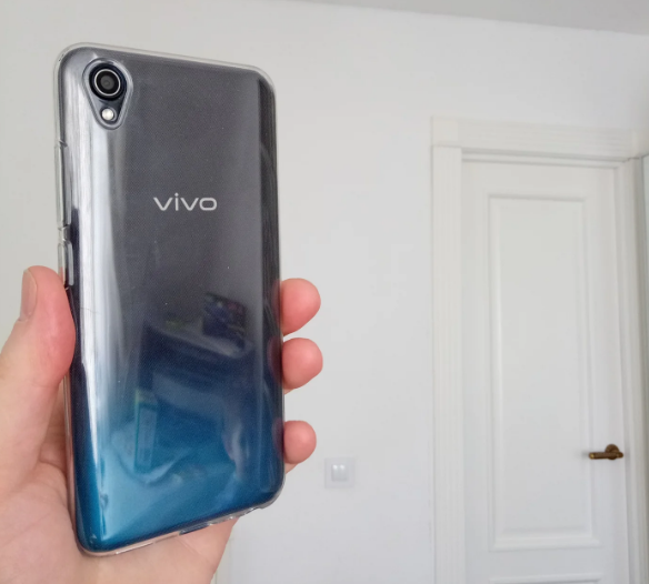 Задняя крышка выполнена из пластика с матовым покрытием. Главная особенность последнего — градиент от черного к синему. Реализовано это эффектно, но уникальным такое решение не назовёшь — Huawei придумала подобную концепцию около 6 месяцев назад и с тех пор почти каждый производитель старается использовать ее в своем творении, Vivo исключением не стало. Отметим, что насколько крышка красивая — настолько и маркая, поэтому без чехла пользоваться смартфоном не рекомендуем, иначе вместо градиента вы поручите заляпанную отпечатками пальцев поверхность. Именно поэтому тот факт, что производитель предусмотрительно положил в коробку со смартфоном силиконовый чехол, не может не радовать.